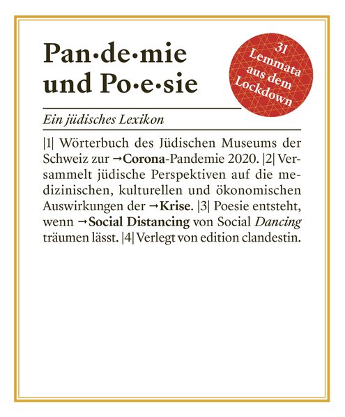 Wahrnehmungen der Pandemie zur Geltung. Kulturschaffende wählten Begriffe aus dem Vokabular der Corona, die indirekt oder unerwartet eine jüdische Bedeutung haben. Entstanden ist eine Sammlung von Neuschöpfungen, Lehnwörtern und neuen Veranstaltungsformaten. Ein Beitrag vom „Volk des Buches“ zur Bewältigung der Corona-Krise: ein Jüdisches Lexikon für Pandemie und Poesie.