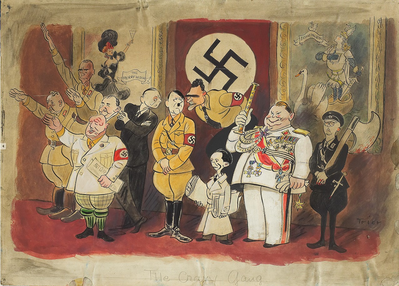 Versammelt sind die wichtigsten Themen in Walter Triers utopischem Kosmos: die oft komische Liebe zwischen Mann und Frau, eine Menge frecher Kinder und ihr fantastisches Spielzeug, viele Stars aus Theater, Film und Sportwelt, Clowns und Zirkusartisten und natürlich seine gezeichneten Kommentare gegen den Nationalsozialismus, der ihn zur Emigration zwang.
