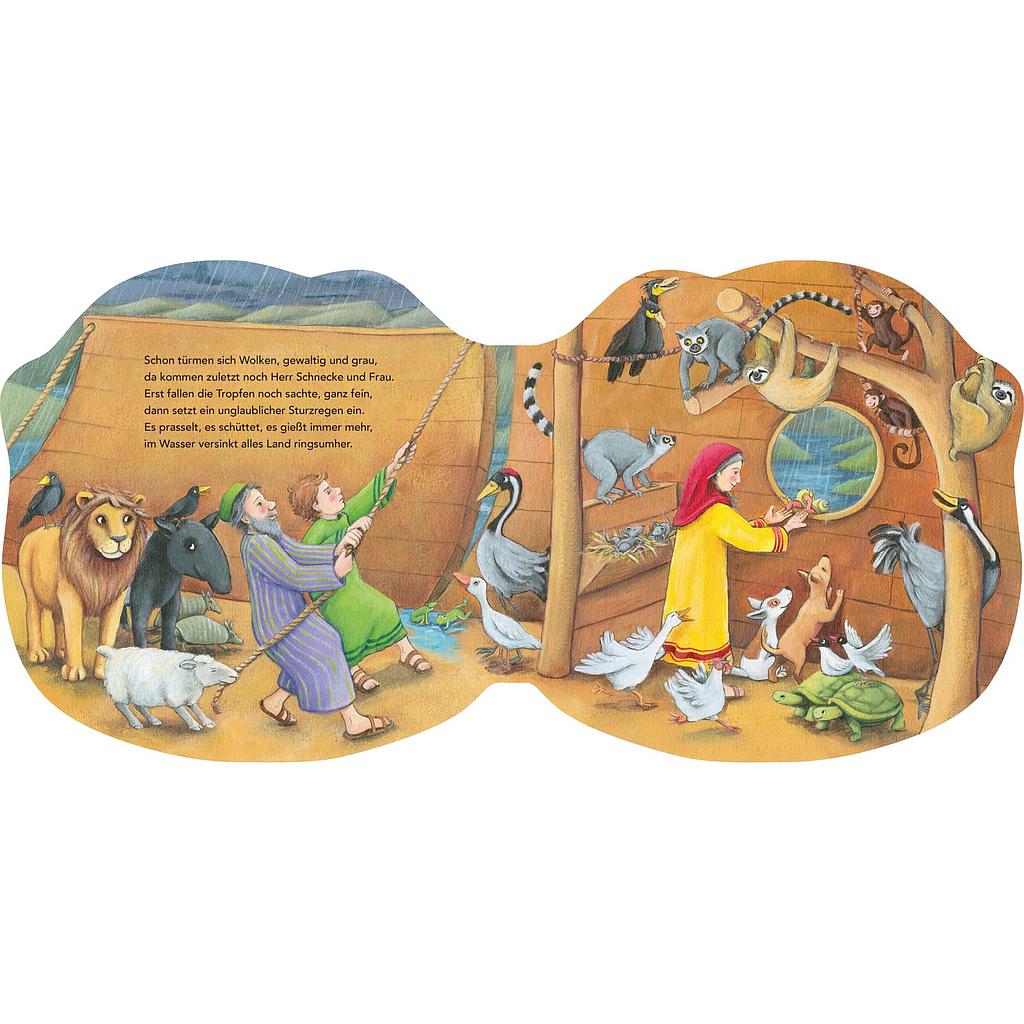 Die biblische Geschichte von Noah, der eine Arche für die Tiere baut. Das kleine Pappbilderbuch in Form der Arche Noah ist lebendig gereimt und liebevoll illustriert. Auf dem Cover gibt es ein Guckloch, durch das man in das Schiff hineinsehen kann. Für Kinder ab 18 Monaten geeignet.