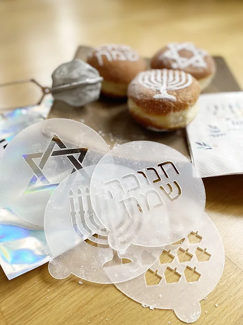 Diese außergewöhnliche Krapfenschablone für Chanukka ermöglicht dekoratives Verzieren von Krapfen oder Kuchen mit vier festlichen Motiven. Aus lebensmittelunbedenklichem Material gefertigt, kann sie gewaschen und wiederverwendet werden und sorgt für eine zauberhafte Chanukka-Dekoration.