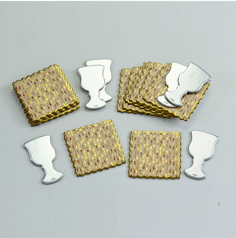 Die goldbraunen Matzen und silbernen Becher, teils mit glänzender Folienoptik, ergänzen jede Pessach-Tafel auf elegante und traditionelle Weise. Ideal als Tischdekoration, Untersetzer oder kreative Ergänzung zu Judaica-Dekor.