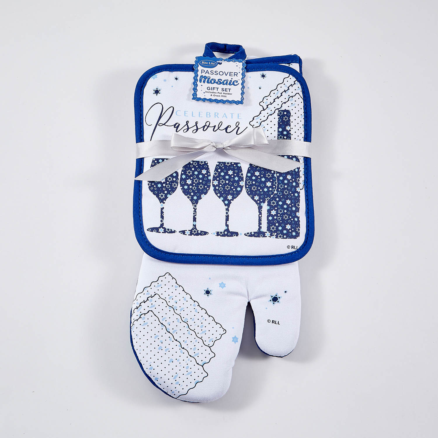 Elegantes Topfhalter-Set *Passover Mosaik* – stilvolle Küchenhelfer für die Pessach-Zeit. Das zweiteilige Set aus hochwertiger Baumwolle besticht durch sein filigranes Mosaikmuster in Blau und Weiß und sorgt für eine festliche Stimmung in der Küche.