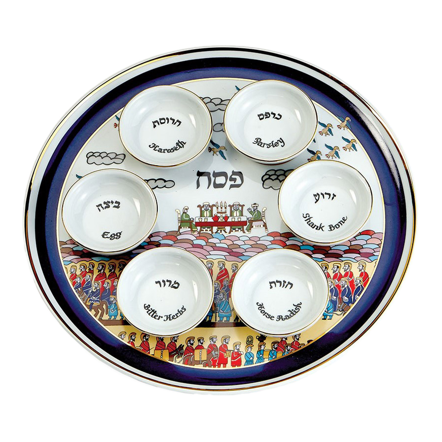 Dieser kunstvoll gestaltete Pessachteller aus Keramik/Porzellan bringt die Pessach-Geschichte farbenfroh und anschaulich auf den Sedertisch. Die sechs separaten Schälchen sind sowohl auf Hebräisch als auch auf Englisch beschriftet und machen die symbolischen Speisen des Seders leicht nachvollziehbar – ideal für Familien, Gäste und Kinder.