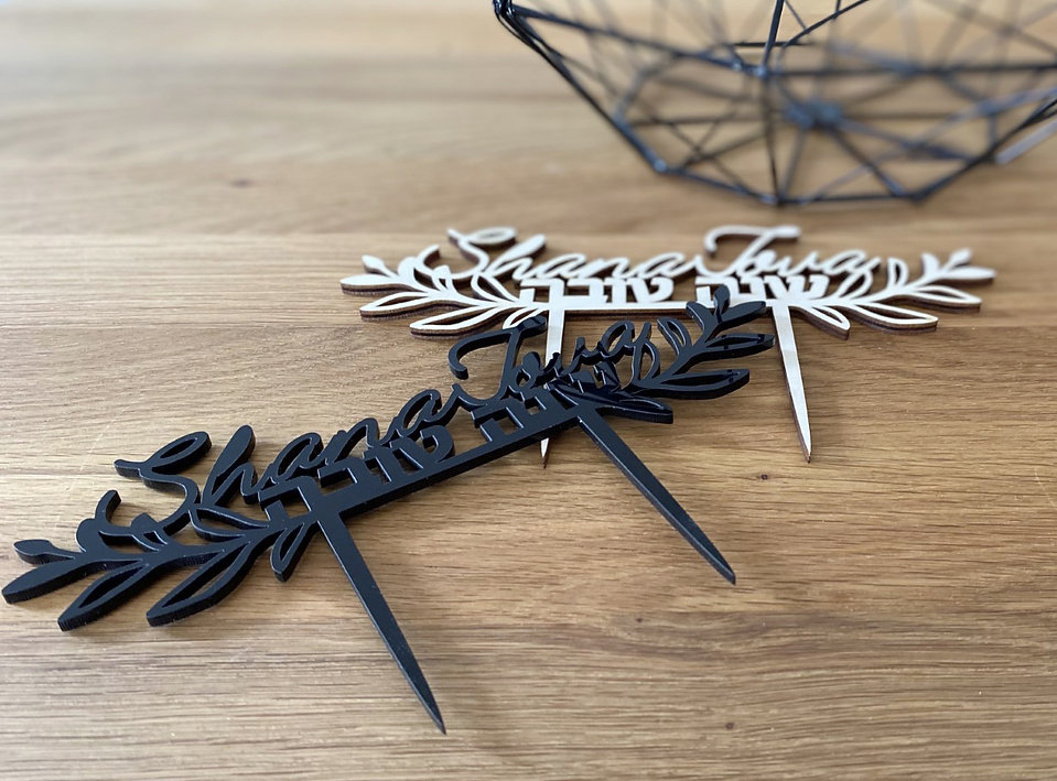 Erhältlich in den Varianten Schwarz oder Holzoptik, vereint der Cake Topper modernes Design mit traditionellem Gruß. Ideal für jüdische Neujahrsfeiern, Schabbat oder festliche Anlässe.