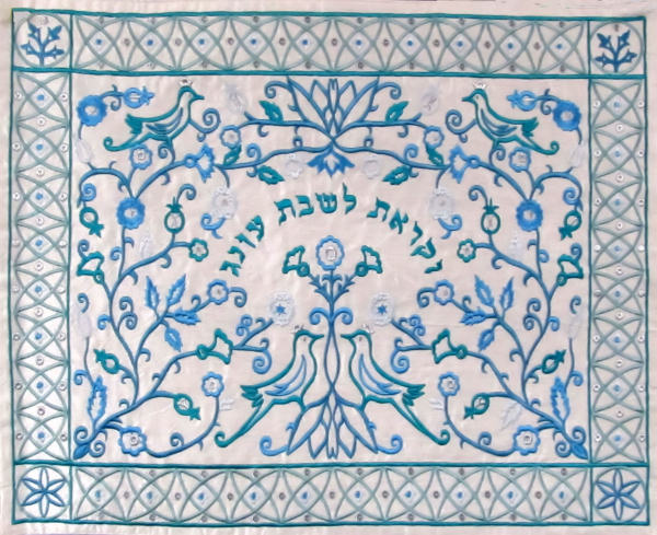 Diese elegante Challadecke aus bestickter Seide zeigt ein zartes Vogelpaar-Motiv in Blau und Hellblau – ein Symbol für Frieden, Harmonie und den Schabbat-Segen. Das feine Stickdesign und die sanften Farbtöne verleihen dem Schabbat- und Jom-Tov-Tisch eine besondere festliche Atmosphäre.