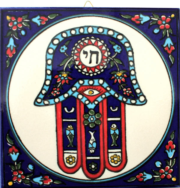 Ein dekorativer Haussegen in Form einer Keramikkachel, verziert mit der Chamsa-Hand und dem hebräischen Schriftzug Chai (חי) – dem Zeichen für Leben. Das rote Blumendekor auf blauem Hintergrund bringt Wärme, Harmonie und positive Energie in jedes Zuhause.