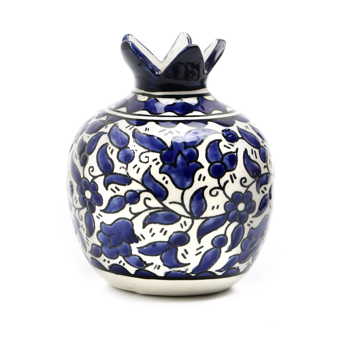 Dieses wunderschöne Dekoobjekt in Granatapfelform aus blau-weißer Keramik ist ein symbolträchtiges Accessoire für Ihr Rosch HaSchana oder als festliche Dekoration im jüdischen Zuhause. Die zahlreichen Kerne des Granatapfels stehen für Hoffnung, Fruchtbarkeit und das Fortleben der Generationen symbolisiert.