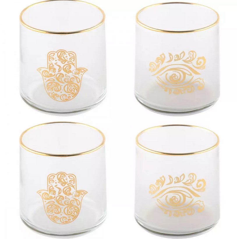 Dieses 4er Set Gläser ist mit goldfarbenen Chamsa- und Augenmotiven verziert und verleiht der festlichen Tafel Ausdruck und Schutzsymbolik. Die Gläser sind ein dekoratives Highlight für Shabbat, Feiertage oder besondere Anlässe.