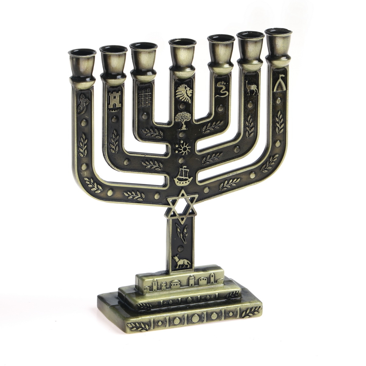 Mit den Symbolen der zwölf Stämme Israels ist dieser Leuchter der bekannten Knesset-Menora nachempfunden. Als Dekorationsobjekt in den Farben schwarz/messing emailliert ist sie ein perfekter Blickfang in jeder Umgebung.