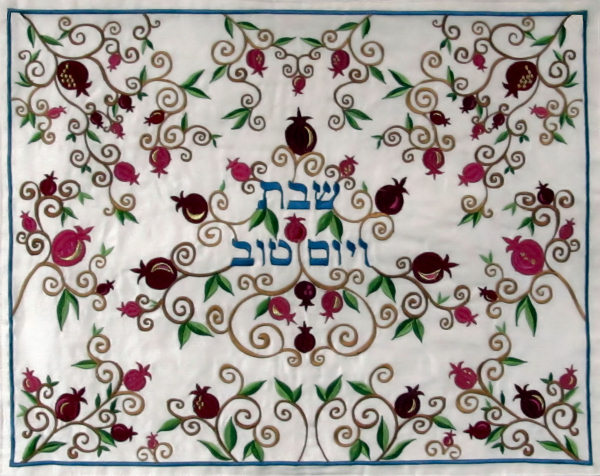 Diese Challadecke aus feiner bestickter Seide überzeugt mit einem detailreichen Motiv aus Granatäpfeln und Ranken in Rot und Grün auf silber/cremefarbenem Hintergrund. Das edle Design bringt festliche Eleganz auf den Schabbat- und Jom-Tov-Tisch und verbindet Tradition mit dekorativer Ästhetik.
