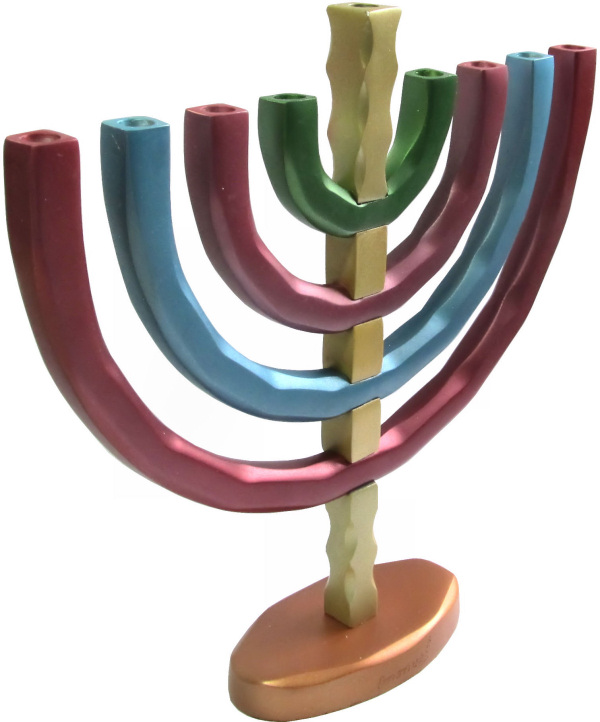 Dieser farbenfrohe Chanukkia-Leuchter aus eloxiertem Metall kombiniert ein modernes, außergewöhnliches Design mit einer verspielten, bunten Farbgestaltung.