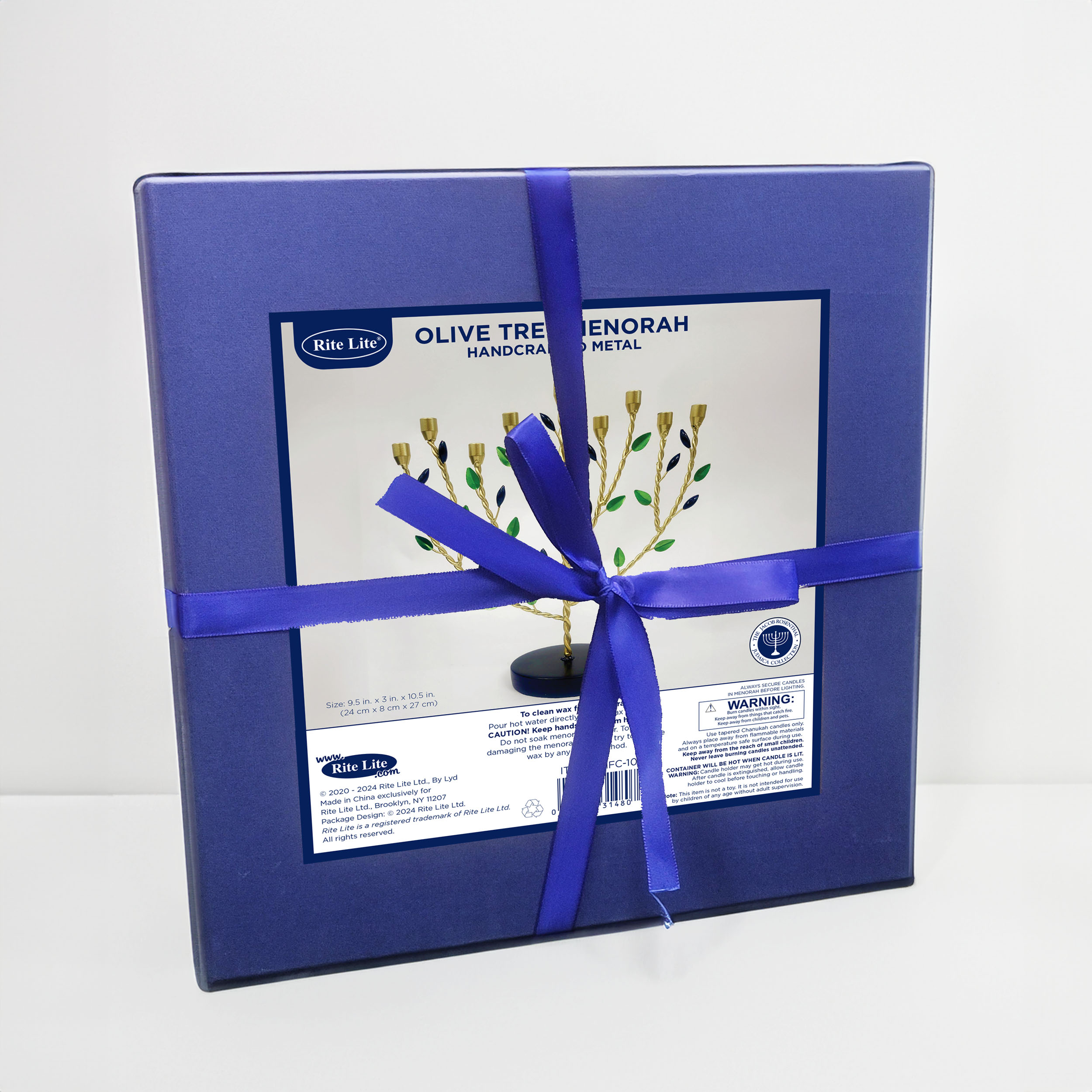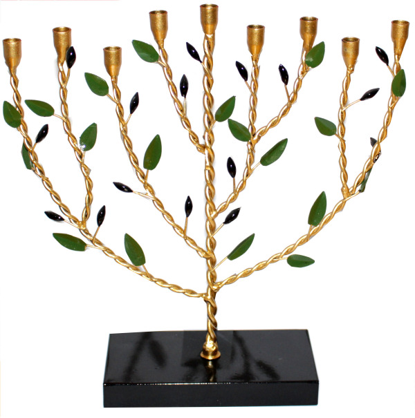 Diese einzigartige Chanukkia ist im Design eines Olivenbaumes gestaltet und erinnert an die Reinheit des Öls im Chanukka-Wunder. Die vergoldeten, gedrehten Äste sind mit grünen Blättern und dunklen Akzenten verziert und verleihen der Menora eine lebendige, symbolträchtige Ausstrahlung. Ein stilvolles Stück, das Tradition und Kunst harmonisch verbindet.