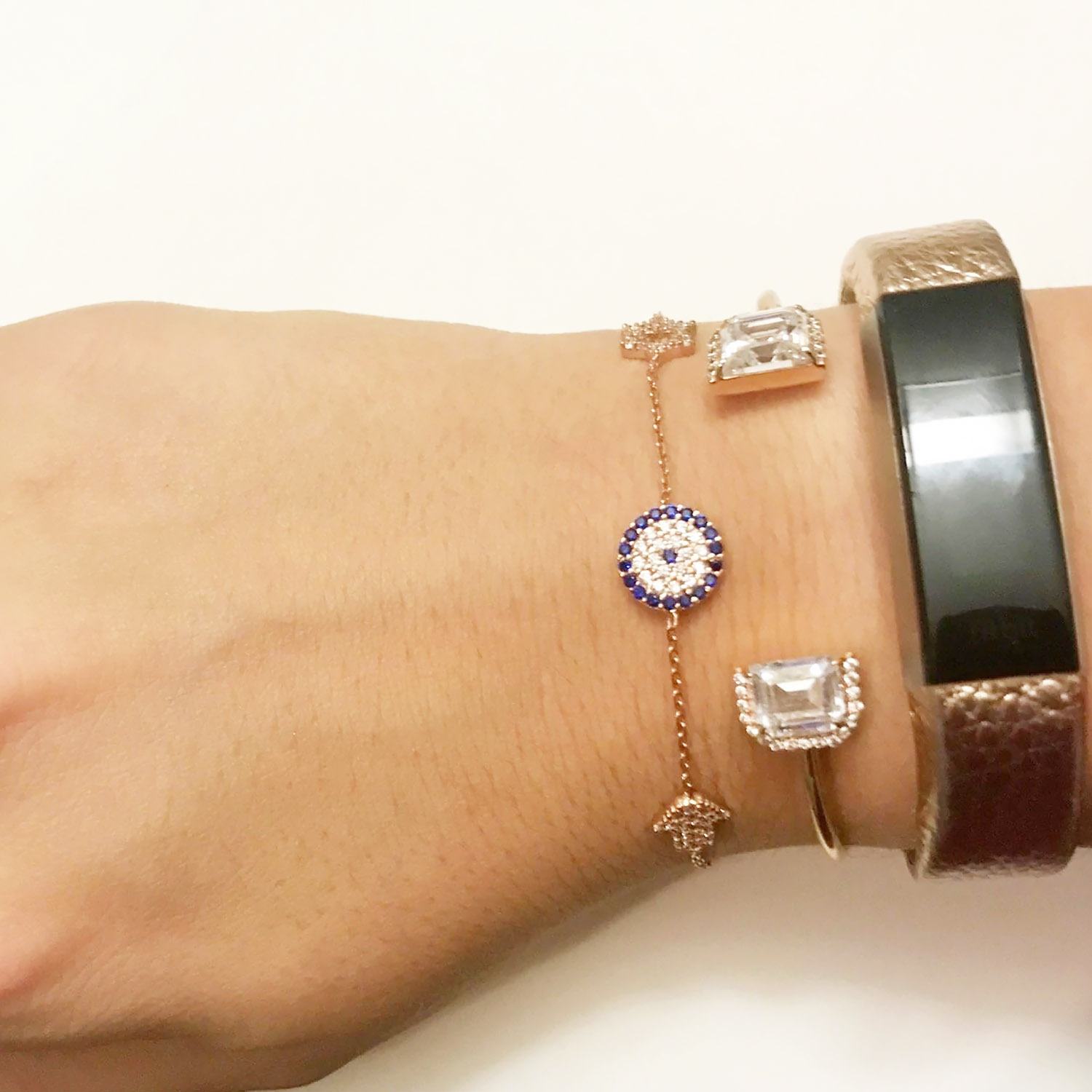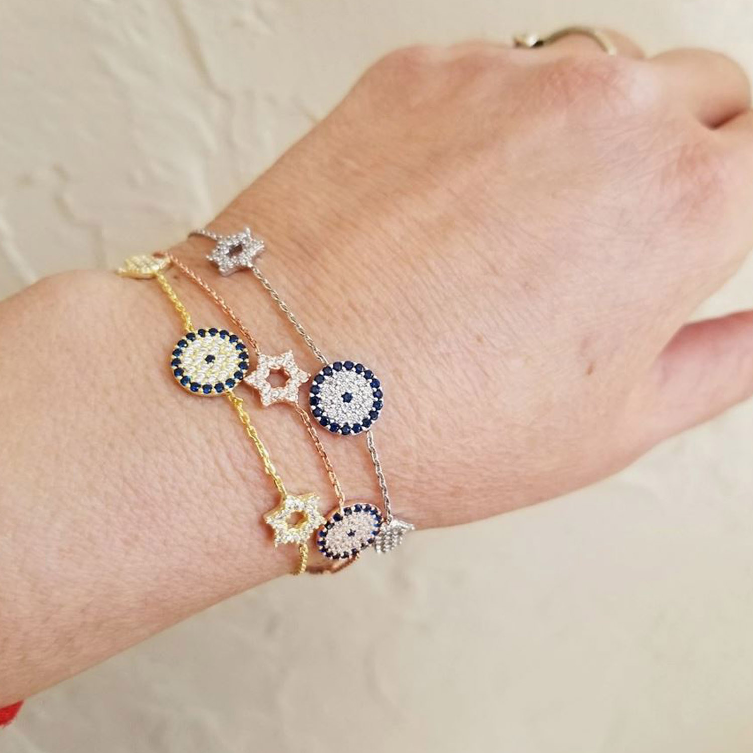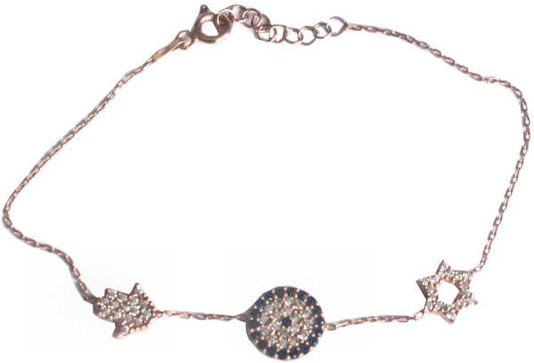 Feines Armband in silber mit einem Davidstern, dem "bösen Blick" und einer Chamsa, auf das Sie niemals verzichten möchten.