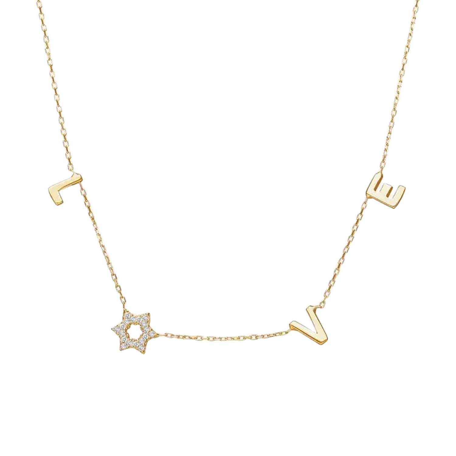 Diese elegante Halskette verbindet modernen Schmucktrend mit symbolischer Bedeutung: Der Davidstern ersetzt das „O“ im Schriftzug LOVE und setzt so ein einzigartiges Statement. Der Anhänger ist mit funkelnden Zirkonia-Steinen besetzt und verleiht der Kette einen stilvollen Glanz.